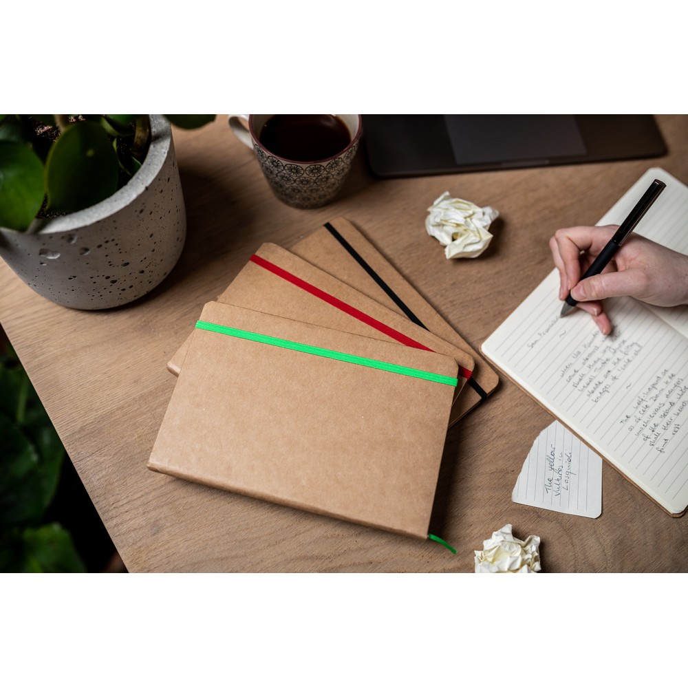 Das Notizbuch „Boldura“ ist der perfekte Begleiter für alle, die ihre Gedanken und Ideen festhalten möchten. Mit seinem hochwertigen Hardcover aus recyceltem Karton und den 96 cremefarbenen linierten Seiten (70 g/m2) bietet es ausreichend Platz für Notizen, Skizzen und mehr. Der praktische Lesezeichenband und der elastische Verschluss sorgen dafür, dass keine Seite verloren geht. Mit „Boldura“ wird das Notieren zu einem stilvollen und umweltbewussten Erlebnis.